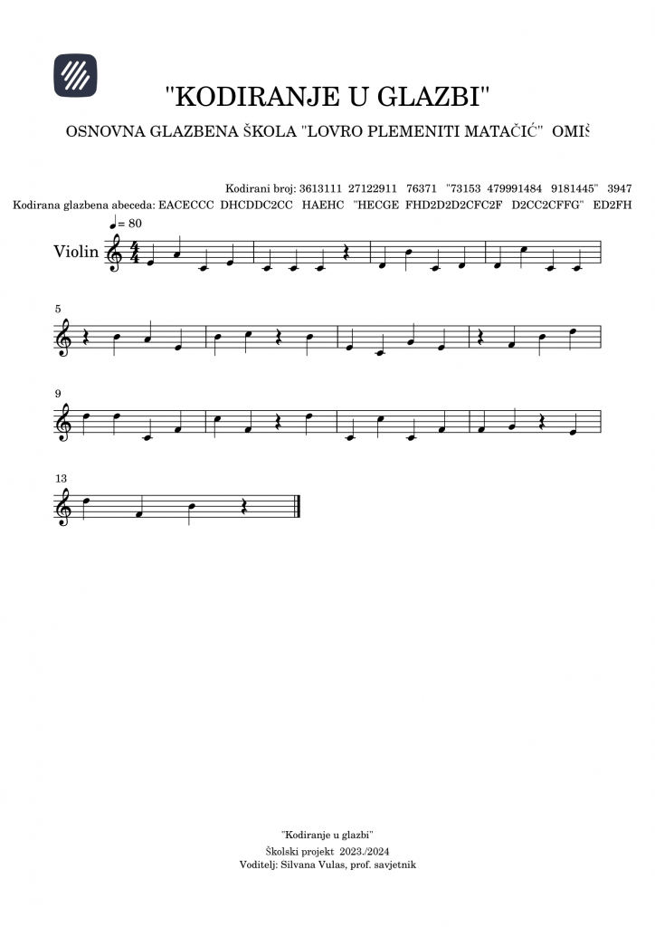 Učenici violine s učiteljicom Silvanom Vulas realizirali su projektne aktivnosti u sklopu projekta Kodiranje u glazbi u suradnji s učenicima Osnovne škole Josip Pupačić te učiteljicama Julijom Tomasović i Marijom Didović. Kodiranjem su nastale nove skladbe te novi pokreti s edukacijskim robotom Micro: Macqueen Plus.